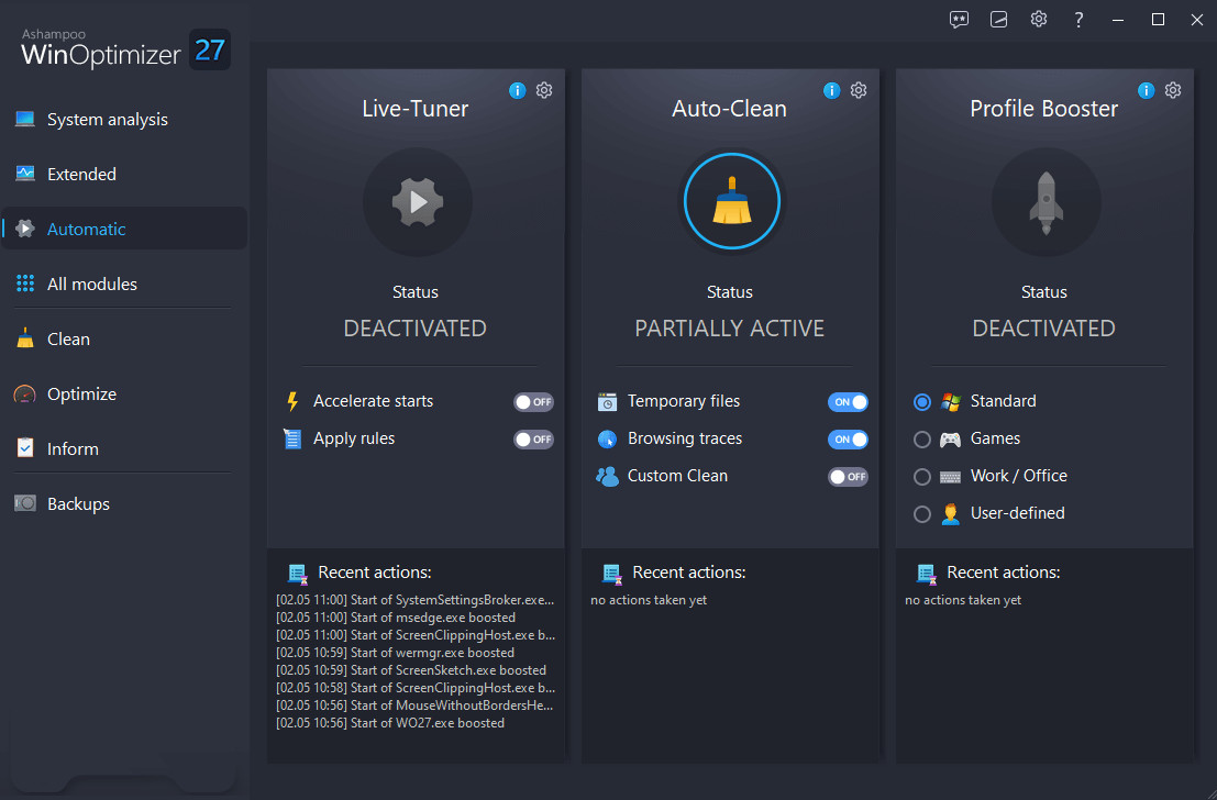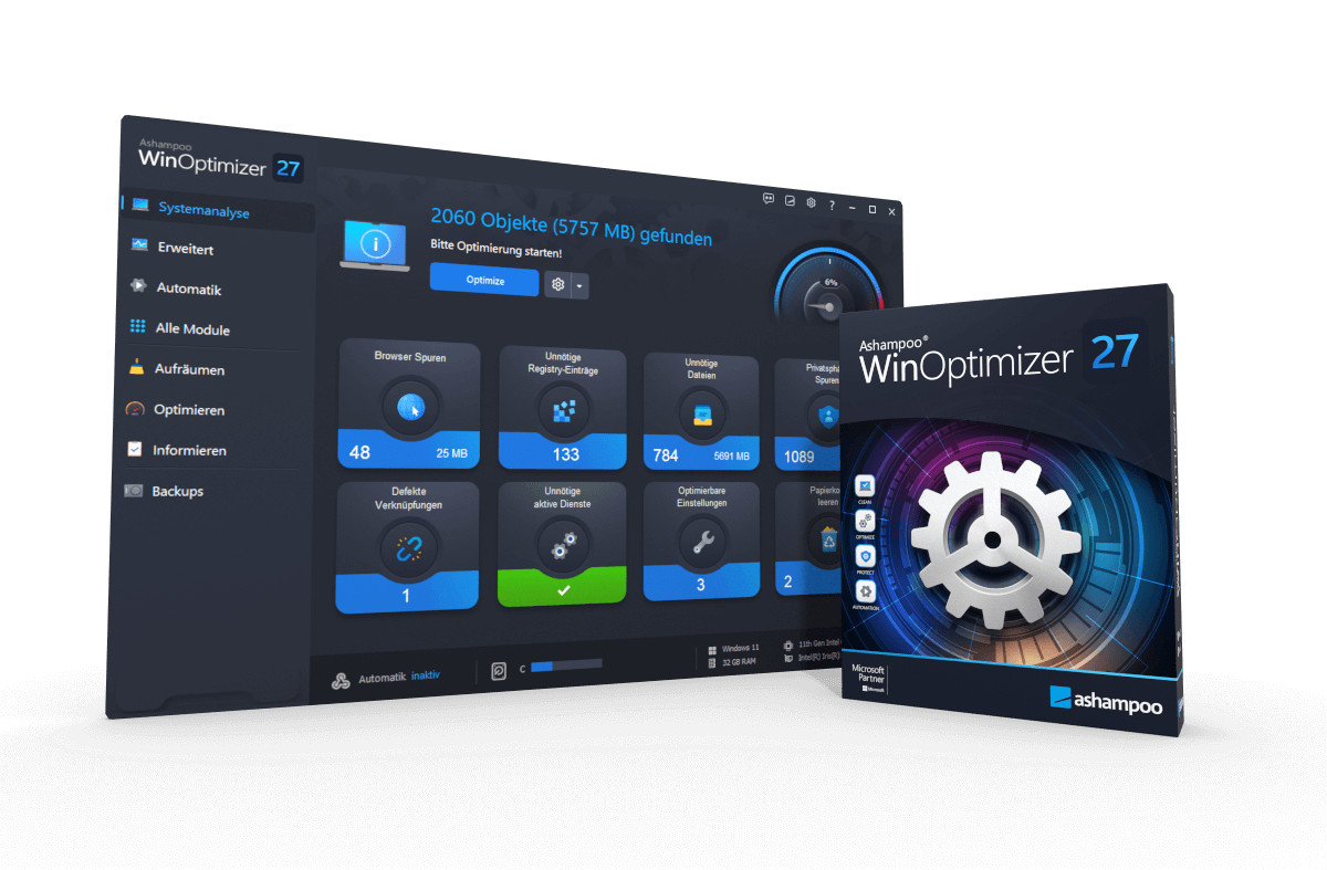 With the new Ashampoo WinOptimizer 27, you automatically get the best Windows experience. Its new automation accelerates, cleans, and tunes your applications. Have your PC seamlessly adapt to your needs with process prioritization, automatic cleanup of temporary files, and custom profile configurations based on the new Profile Booster. Whether for gaming, work, or browsing, maximize your system’s performance or conserve resources, the choice is yours. The new Crash Analyzer offers deep insights into system crashes and their causes, while four advanced cleaners ensure privacy and provide system maintenance. Thanks to improved memory management, WinOptimizer can now utilize more resources to perform comprehensive analyses almost instantly!