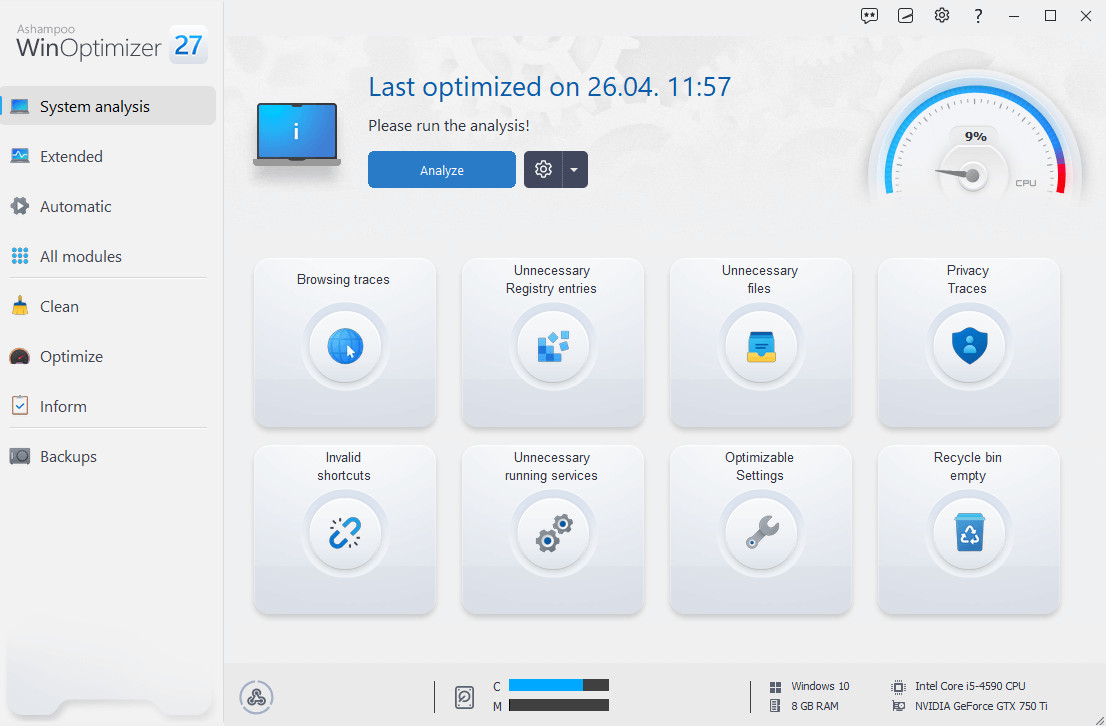 The newly designed system analysis tells you everything you need to know at a glance. Aside from the CPU load speedometer, you now also get a first-hand look at disk usage and privacy-related information, courtesy of our new Privacy Traces Cleaner! Increase the size of the program window for even more valuable system details, like number of irrelevant files, services, and Registry entries, or the amount of potentially reclaimable disk space. The system analysis will tell you what you need to know!